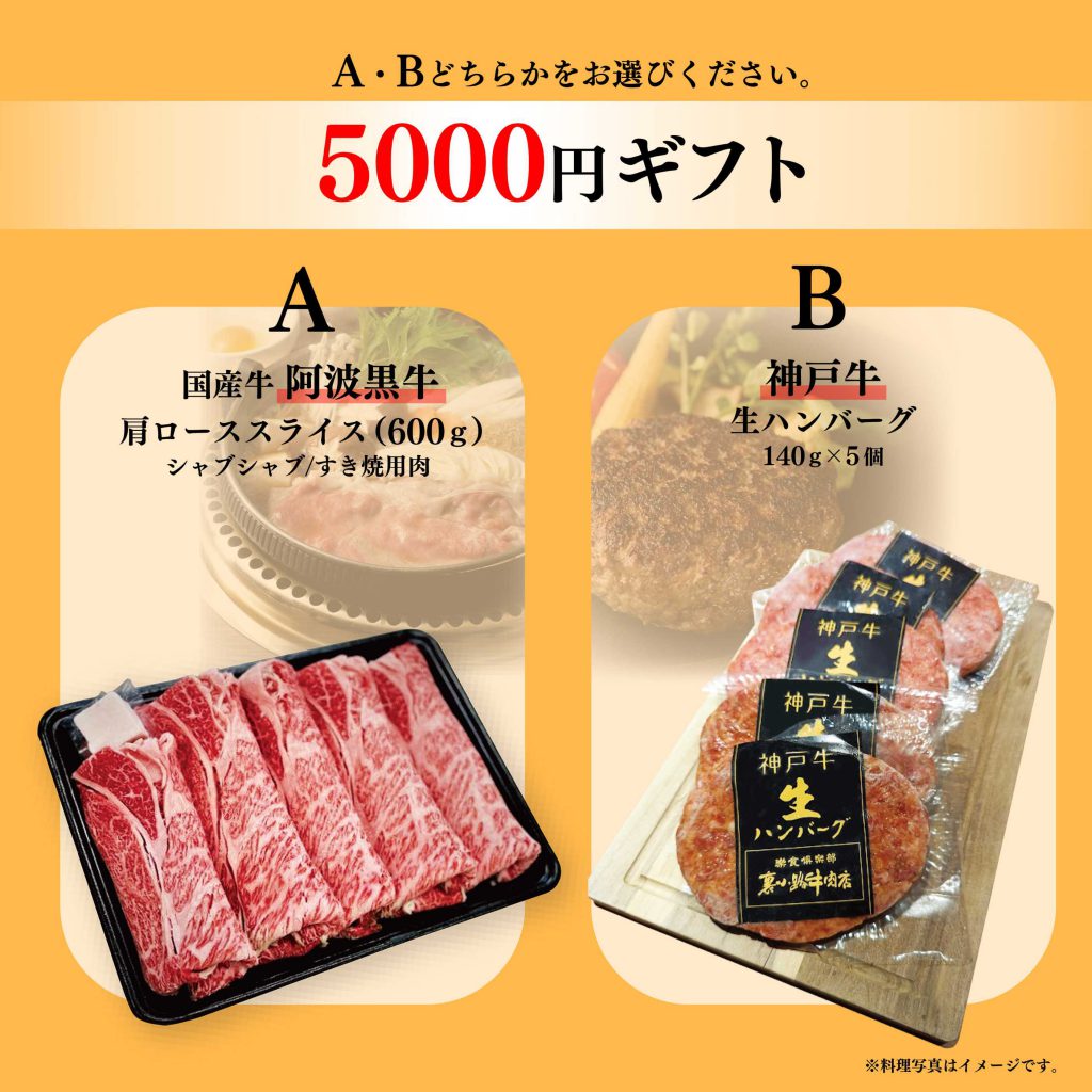 A:国産牛 阿波黒牛 肩ローススライス(600g) しゃぶしゃぶ/すき焼き肉 B:神戸牛生ハンバーグ (140g×5個) ※A、Bの2種のうち1種を選択してください。